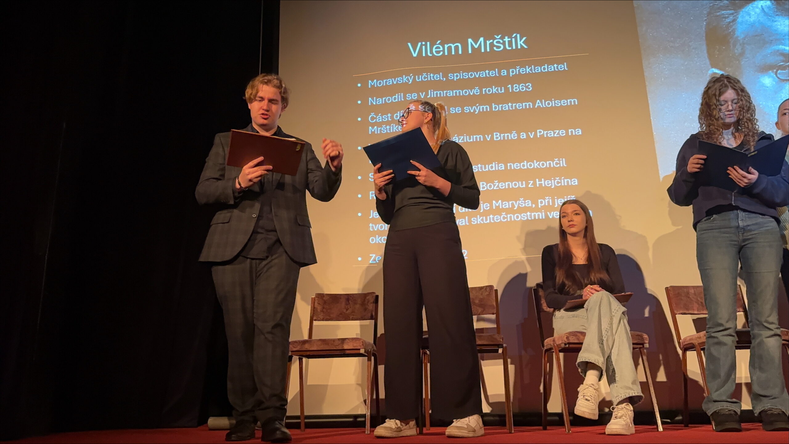 Součástí příjemného dopoledne bylo také scénické čtení ukázek z děl českých klasiků, které předvedli studenti druhého ročníku. Tato aktivita jim umožnila vyzkoušet si, jaké to je stát na pódiu před publikem a vžít se do role herce. Lenka Wimmerová, která jejich výkony pozorně sledovala, aby je následně, ze své pozice režisérky, mohla zhodnotit.